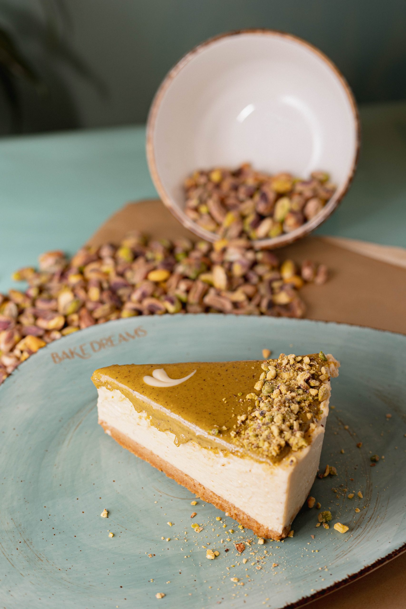 Base de galleta crujiente y crema suave de queso con pasta de pistacho; textura cremosa y aroma a fruto seco, terminado con pistachos tostados por encima.